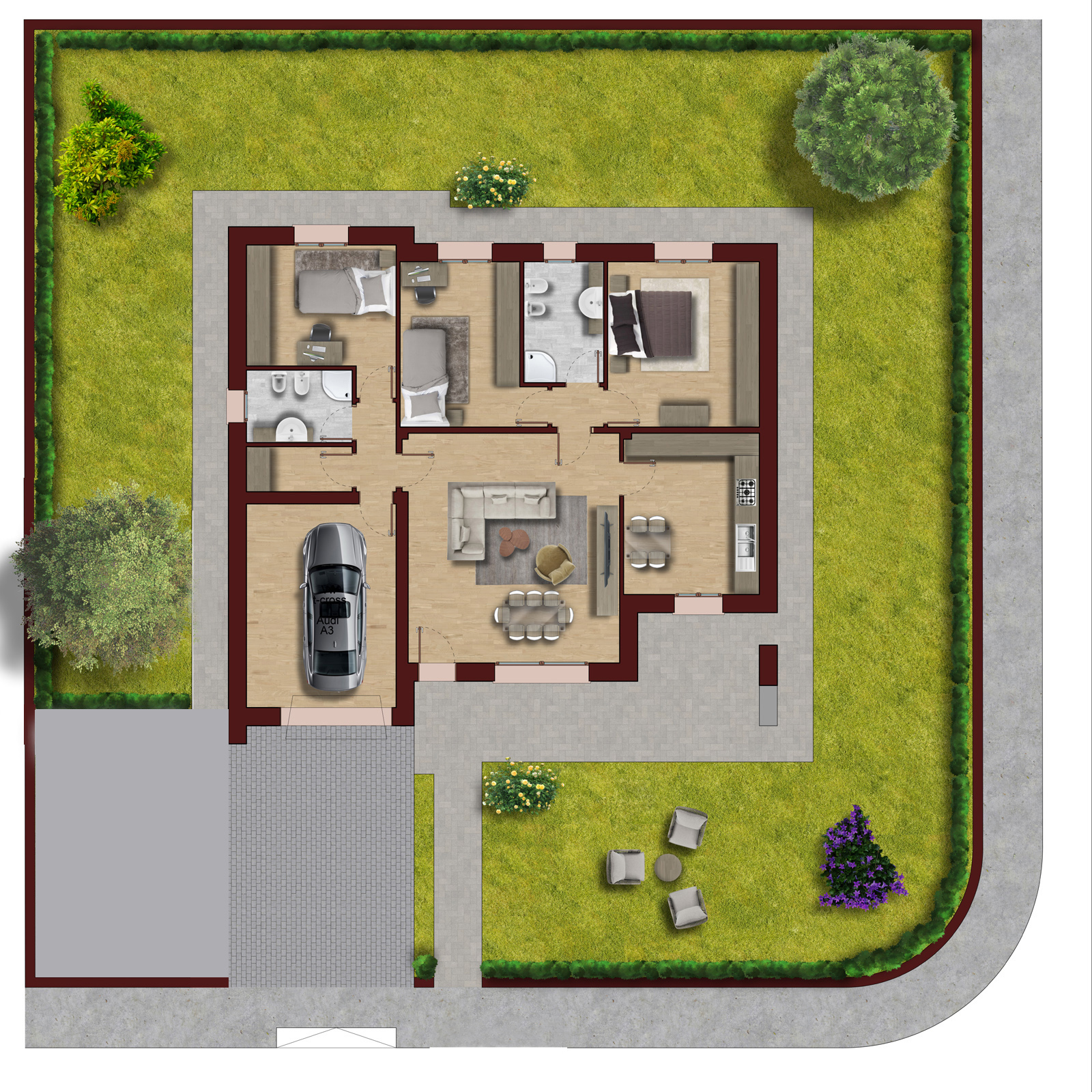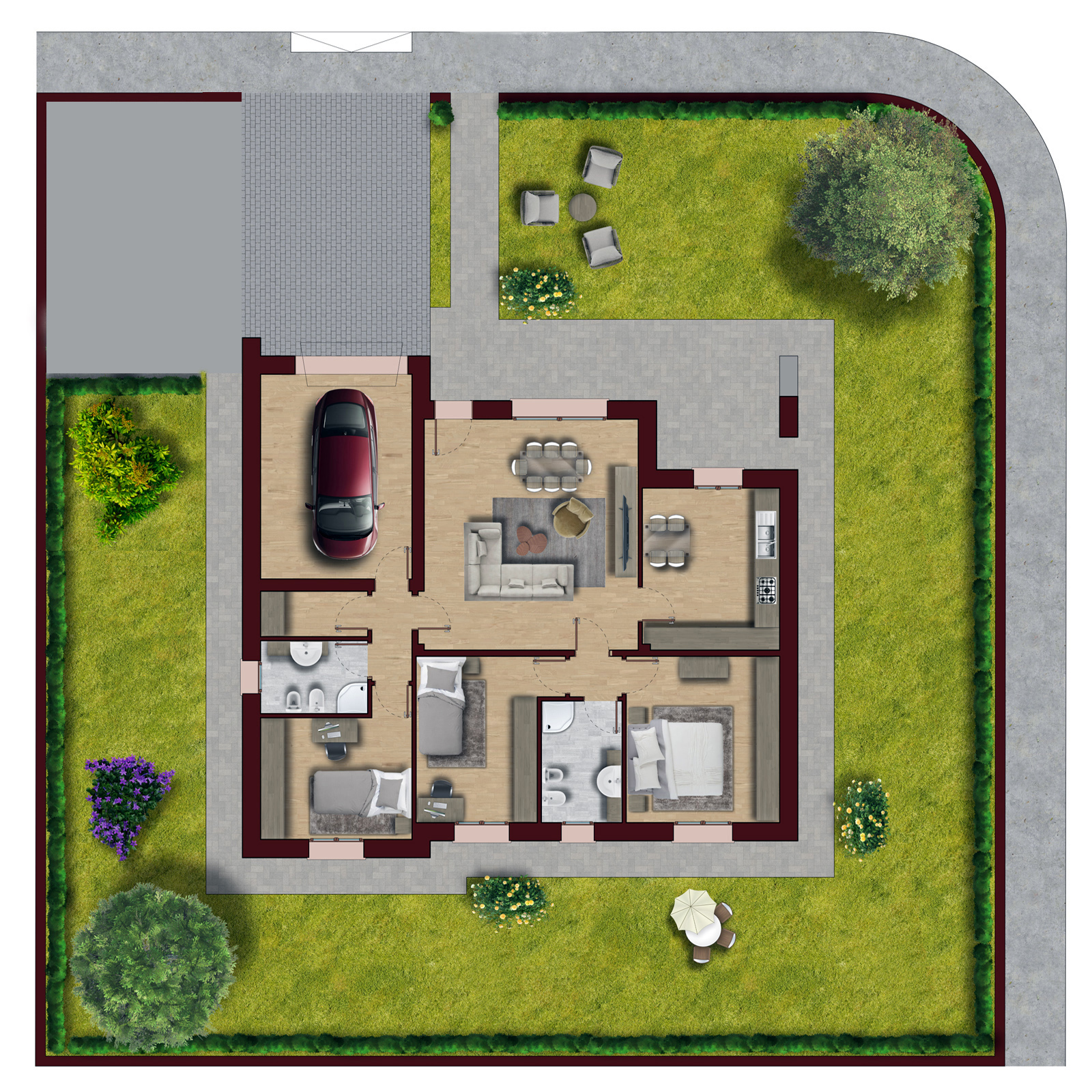 Unità immobiliari monofamiliari composte da da: soggiorno cucina, tre camere, due bagni, disimpegno, garage e vano tecnico. Completano la proprietà giardino e posto auto di pertinenza.